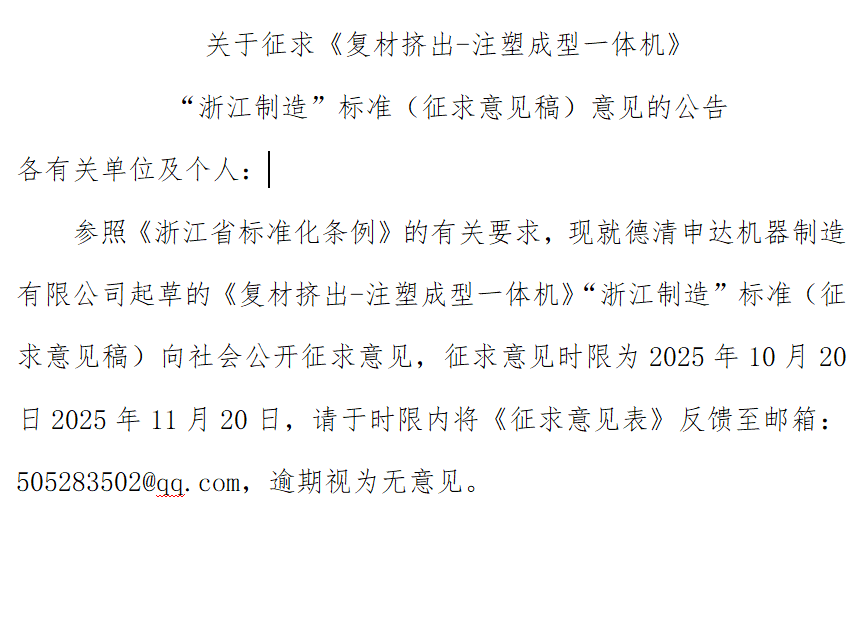 各有關單位及個人:參照《浙江省標準化條例》的有關要求,現(xiàn)就德清申達機器制造有限公司起草的《復材擠出-注塑成型一體機》“浙江制造”標準(征求意見稿)向社會公開征求意見,征求意見時限為2025年10月20日2025年11月20日,請于時限內將《征求意見表》反饋至郵箱:505283502@qq.com,逾期視為無意見。附件:關于征求.docx團體標準?71.docx征求意見表.docx編制說明.doc